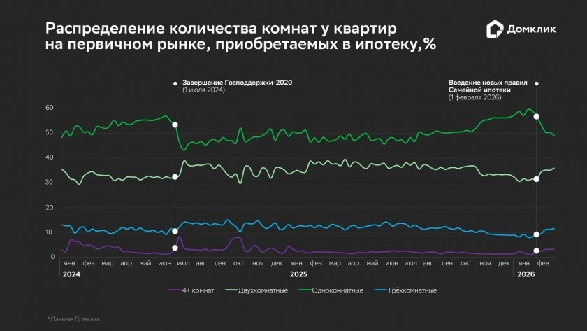 Перед сворачиванием программы Господдержка-2020 выросла доля однокомнатных квартир: максимум (56,9%) был достигнут за две недели до завершения программы. Перед ужесточением условий выдач "Семейной ипотеки" пик доли малогабаритных лотов также был достигнут за 2 недели введения новых правил – с 19 по 25 января 2026 года их доля в выдачах достигла 60%.