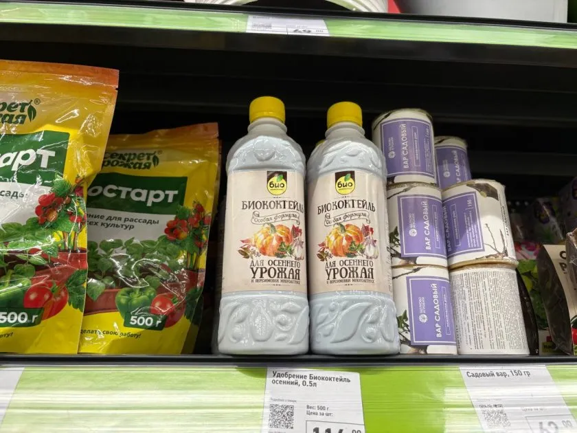 Дальше я залипла на полке с удобрениями и средствами защиты. Нашла биококтейль для осеннего урожая на будущее. Производитель обещает, что он помогает растениям подготовиться к зиме и лучше пережить холода. Для многолетников вроде роз и гортензий - самое то.