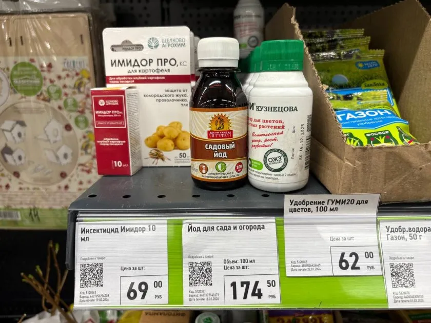 Прихватила универсальный Гуми20. Это органическое удобрение, которое подходит практически для всего. Еще в корзину отправился йод - я им поливаю огурцы от пожелтения, работает отлично. И отдельно лежал "Имидор 10". На коробке написано, что он враг тли, белокрылки и прочей нечисти, причем работает даже в жару. Для нашего юга это актуально, потому что в зной многие препараты бесполезны.