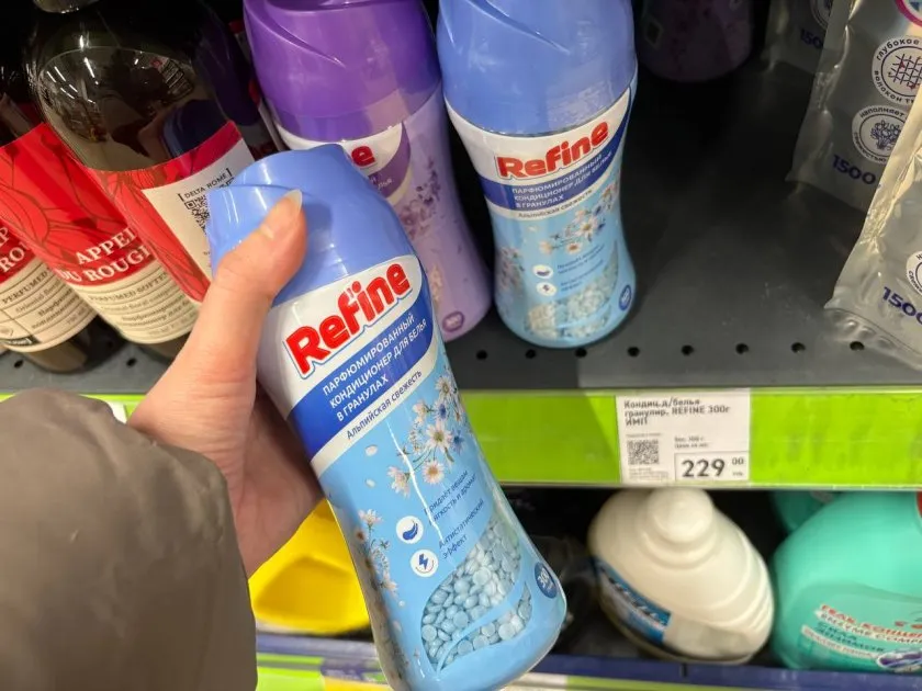 Дальше мой взгляд упал на гранулированный кондиционер для белья. Упаковка увесистая, стоит 230 рублей. Запахов несколько, я выбрала альпийскую свежесть. Люблю, когда белье пахнет чистотой и легкой прохладой. Пока не пробовала, но надеюсь, что средство окажется достойным. По крайней мере, выглядит симпатично.
