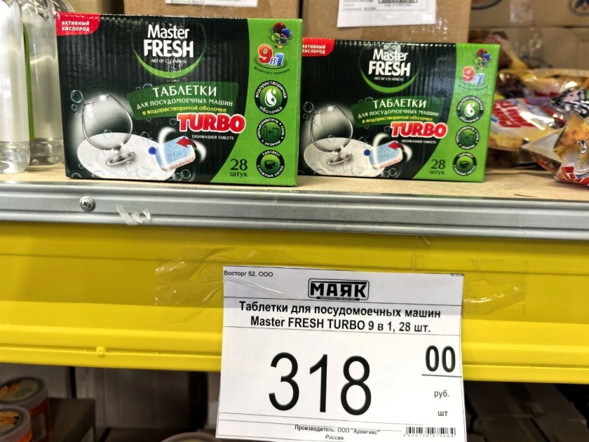 Первое, что бросилось в глаза — таблетки для посудомоечной машины. Вечно на них смотрю, но беру не всегда. В этот раз решилась. Упаковка стоила 318 рублей. Для ежедневного мытья посуды — нормальная цена. Посмотрим, как отмоют сковородки.