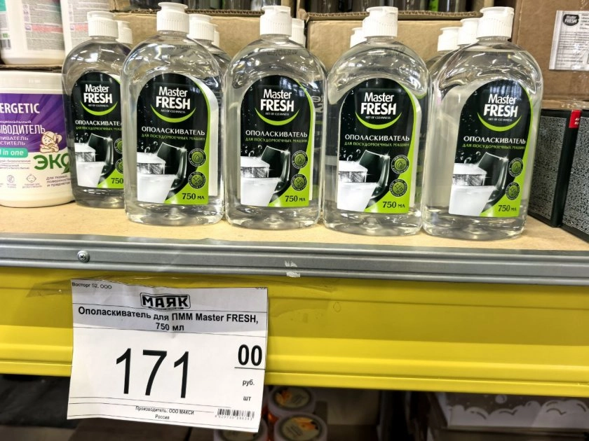 Рядом на полке стоял ополаскиватель для посудомойки. Мелочь, а без нее разводы на стаканах остаются. Взяла на пробу. Надеюсь, стеклянные чашки снова будут прозрачными, а не мутными.