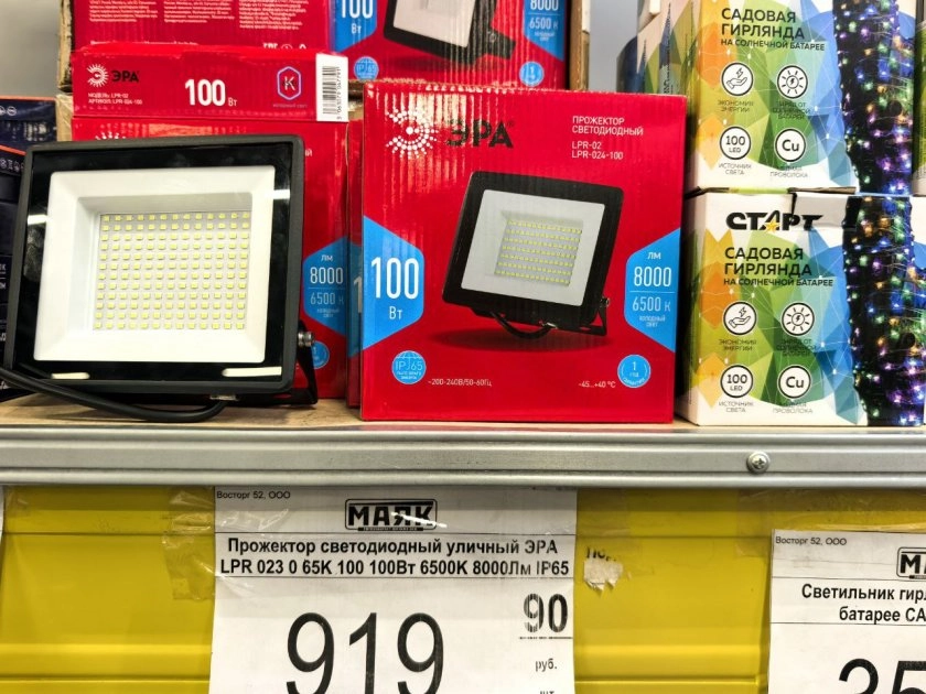 Еще нашла уличный прожектор. Недорогой, но мощный. Подумала, что можно повесить на даче над крыльцом или возле мангала. Когда вечером собирается компания, всегда не хватает света. А этот прожектор спокойно переживает дождь и снег. Для сада или частного дома — отличная вещь.
