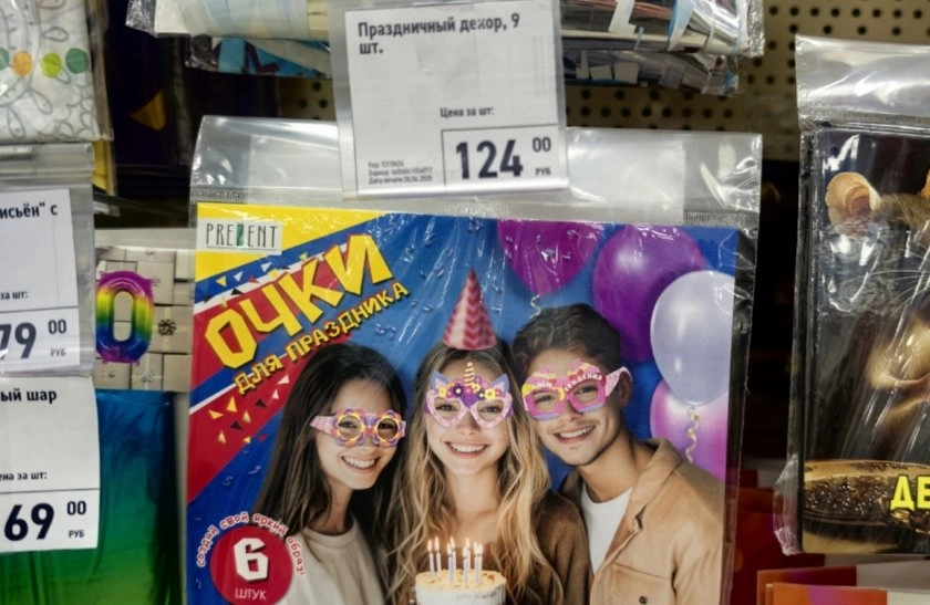 Первое, что бросилось в глаза - огромный стенд с товарами для празднования дней рождения. Похоже, сеть серьезно подготовилась к сезону торжеств. Взгляд сразу зацепился за забавные очки в разной оправе - с губами, звездочками, смешными бровями. Такие мелочи мгновенно создают настроение на любой вечеринке. Цена - 124 рубля. Дешевле, чем билет в кино, а радости на целый вечер.