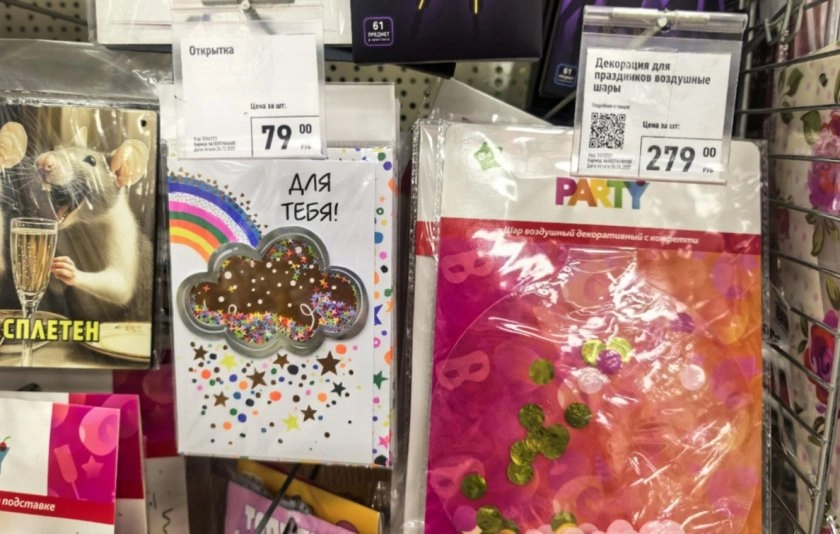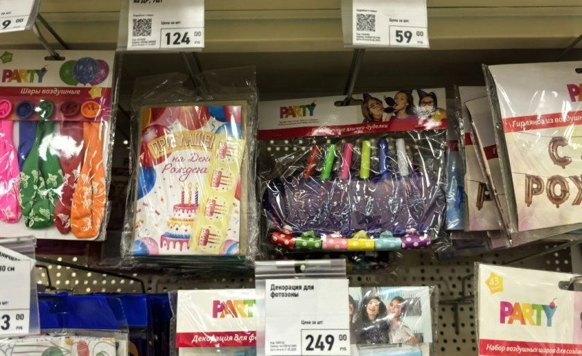 Рядом обнаружилась целая секция с декорациями. Воздушные шары всех цветов радуги, яркие открытки с пожеланиями на любой вкус, гирлянды, растяжки. Можно за пару сотен рублей собрать полный набор для детского праздника или небольшой корпоратива. И, конечно, куда без дуделок и пищалок? На полках их было несколько видов.