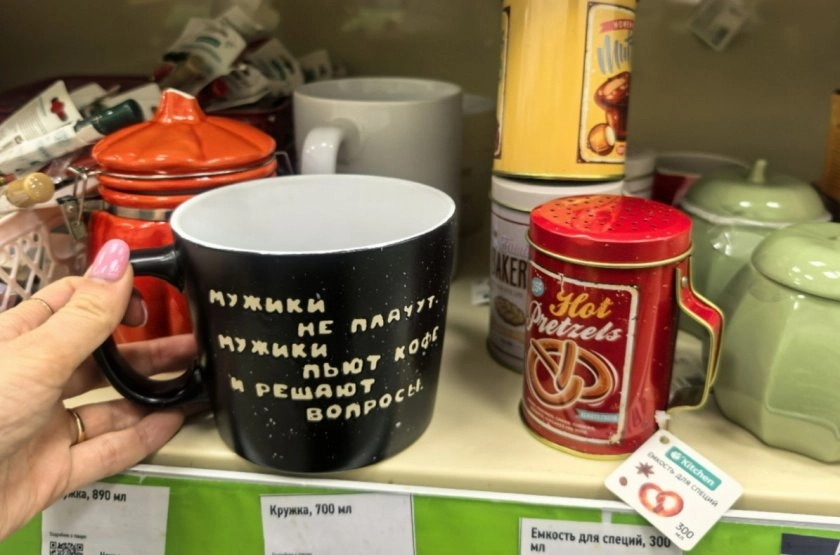 А главная находка дня - кружка с надписью "Мужики не плачут, мужики пьют кофе и решают вопросы". Автор признается: мимо такой не пройти. Толстая керамика, принт держится крепко, ручка удобная. Даже если не пить из нее каждый день, в качестве подарка коллеге или другу - идеальный вариант. Стоит копейки, а выглядит так, будто заказывали с маркетплейса за тысячу рублей.