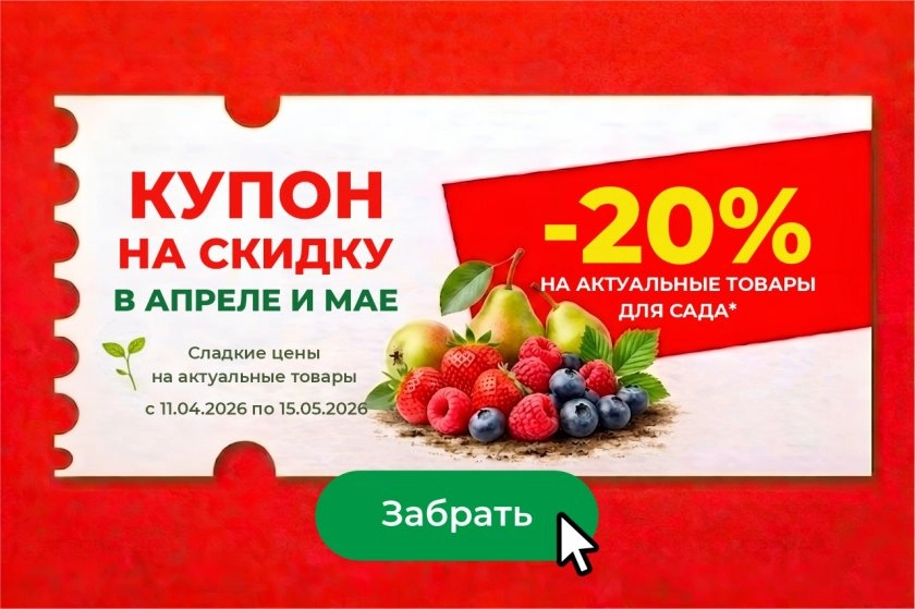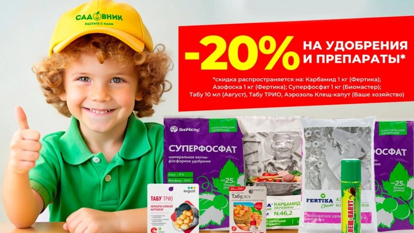 До 15 мая 2026 г. для владельцев карт “Садовник” скидка -20% действует на удобрения и препараты: “Карбамид” (ТМ “Фертика”), “Азофоска” (ТМ “Фертика”), Суперфосфат (ТМ “Биомастер”), “Табу” (ТМ “Август”), “Табу Трио”, аэрозоль “Клещ-капут” (ТМ “Ваше хозяйство”).