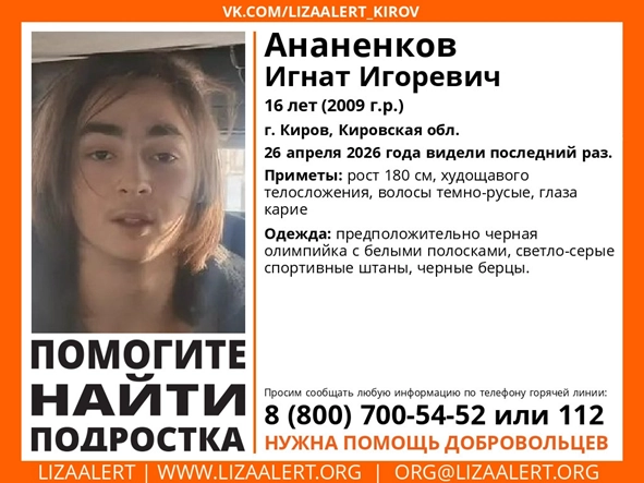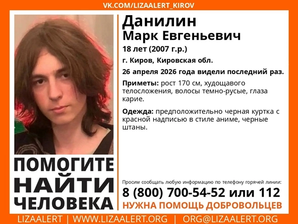 В понедельник, 27 апреля, кировские волонтеры объявили о начале поисков двух пропавших подростков - 18-летнего Игната Игоревича Ананенкова и 16-летнего Марка Евгеньевича Данилина. Обоих в последний раз видели в городе Кирове в воскресенье, 27 апреля. С тех пор информации об их местонахождении нет.