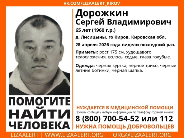 Во вторник, 28 апреля, кировские волонтеры запросили помощь в поиске Сергея Владимировича Дорожкина. Мужчине 65 лет. В последний раз его видели в пригороде Кирова утром в указанный день. Поисковики предупреждают, что пропавший пенсионер нуждается в медицинской помощи.