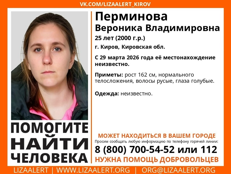 В среду, 29 апреля, кировские поисковики попросили неравнодушных о помощи в распространении информации о Веронике Владимировне Перминовой. 25-летняя девушка из Кирова отправилась в неизвестном направлении еще в конце марта. Даже спустя месяц данных о местонахождении пропавшей нет.