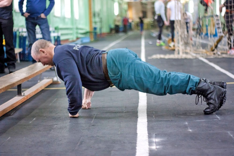 Во время сдачи нормативов бывший начальник караула ПЧ-3 Константин Мамаев отжался от пола 100 раз.