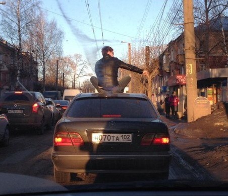 Первого апреля молодой человек решил покататься на крыше "Мерседеса". Автомобиль с мужчиной на крыше засняли из ехавшей сзади машины.