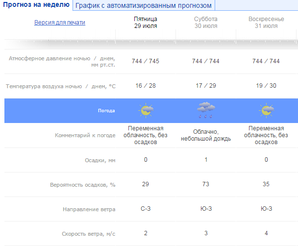 - в субботу, 30 июля, ожидается облачная погода, небольшой дождь. Температура воздуха днем +29°C, а ночью +17°C;