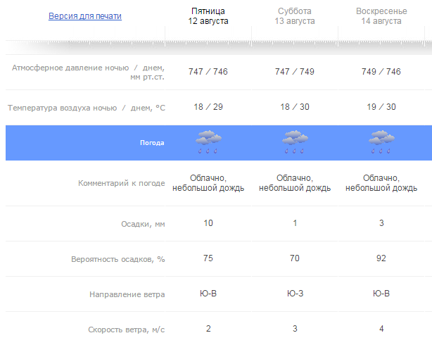 - в субботу, 13 августа, ожидается облачная погода, пройдет дождь. Температура воздуха днем +30°C, а ночью +18°C;