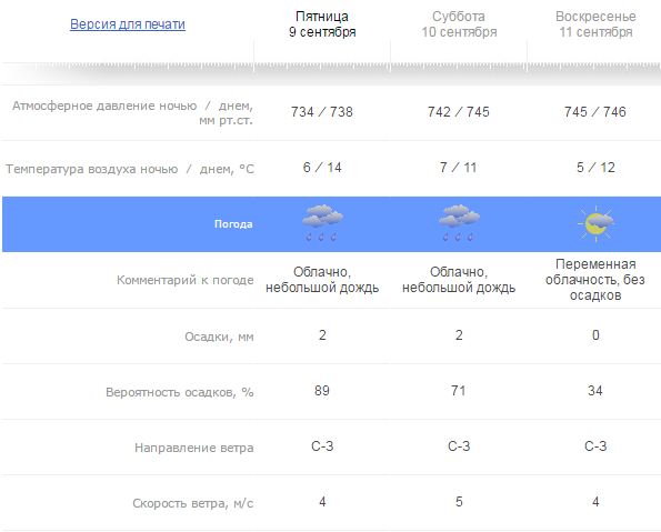 - в субботу, 10 сентября, ожидается облачная погода, пройдут дожди. Температура воздуха днем +11°C, а ночью +7°C;