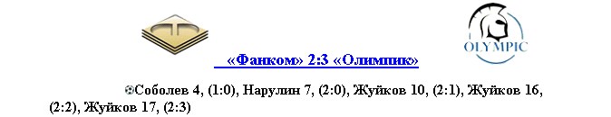 Веселую игру показали коллективы «Фанком» и «Олимпик». Номинальные хозяева свой первый же момент и повели в счете. Тут же Нарулин Максим дальним ударом сделал преимущество «Фанкома» более комфортным. «Олимпик» сразу же поменяли вратаря, а в поле роль спасителя возложил на свои плечи Жуйков Евгений, который своим хеттриком перевернул игру с ног на голову. Второй тайм «Олимпик» больше оборонялся, играл от защиты, и такая тактика им удалась. Как не пытались хозяева вскрыть оборону, не как у них не получалось. В результате волевая победа гостей.