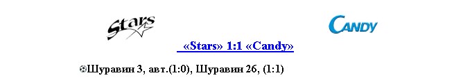 Коллектив «Stars» в этой игре оформляет первое досрочное чемпионство Лиги Здорового Бизнеса в дивизионе «В». Игра складывалась не так легко, как бы хотелось, для новоиспеченного чемпиона. Героем матча в это встрече стал Шуравин Илья. На первых же минутах Илья перепутал ворота и забил своей команде гол. Конечно, нет, это была шутка с долей правды. Илья не аккуратно отпасовал мяч назад вратарю, а тот неуклюжа, пропустил мяч под ногой. В результате 1:0 и «Candy» в роли догоняющих. Отыгрываться пришлось целый тайм. В начале второго тайма тот же Илья Шуравин, видно чувствуя вину за собой, красивейшим ударом в падении направляет мяч в дальний угол. На волне успеха «Candy» попытался предпринять несколько попыток к взятию ворот, но достичь результата у них не получилось. Такая нужная и ненужная ничья.