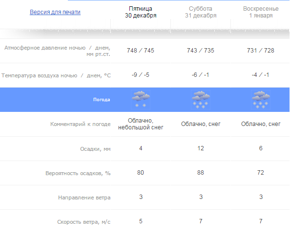 - в субботу, 31 декабря, облачно, снегопад. Температура воздуха днем -1°C, а ночью -6°C. Ветер западный, 7 метров в секунду;