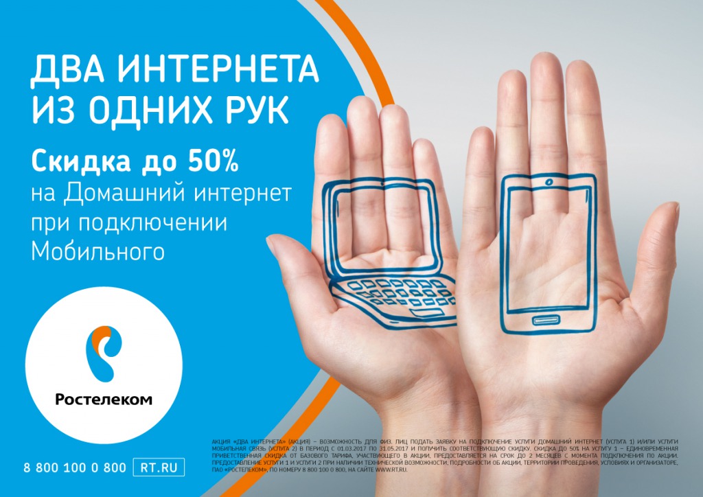 «Ростелеком» проводит федеральную акцию «Два интернета», которая делает домашний интернет мобильным. При одновременном подключении и использовании услуг безлимитного интернета дома и мобильной связи «Ростелекома» будет доступна скидка до 50 процентов на «Домашний интернет». В акции могут принять участие все члены семьи, что позволит получить максимальную выгоду.