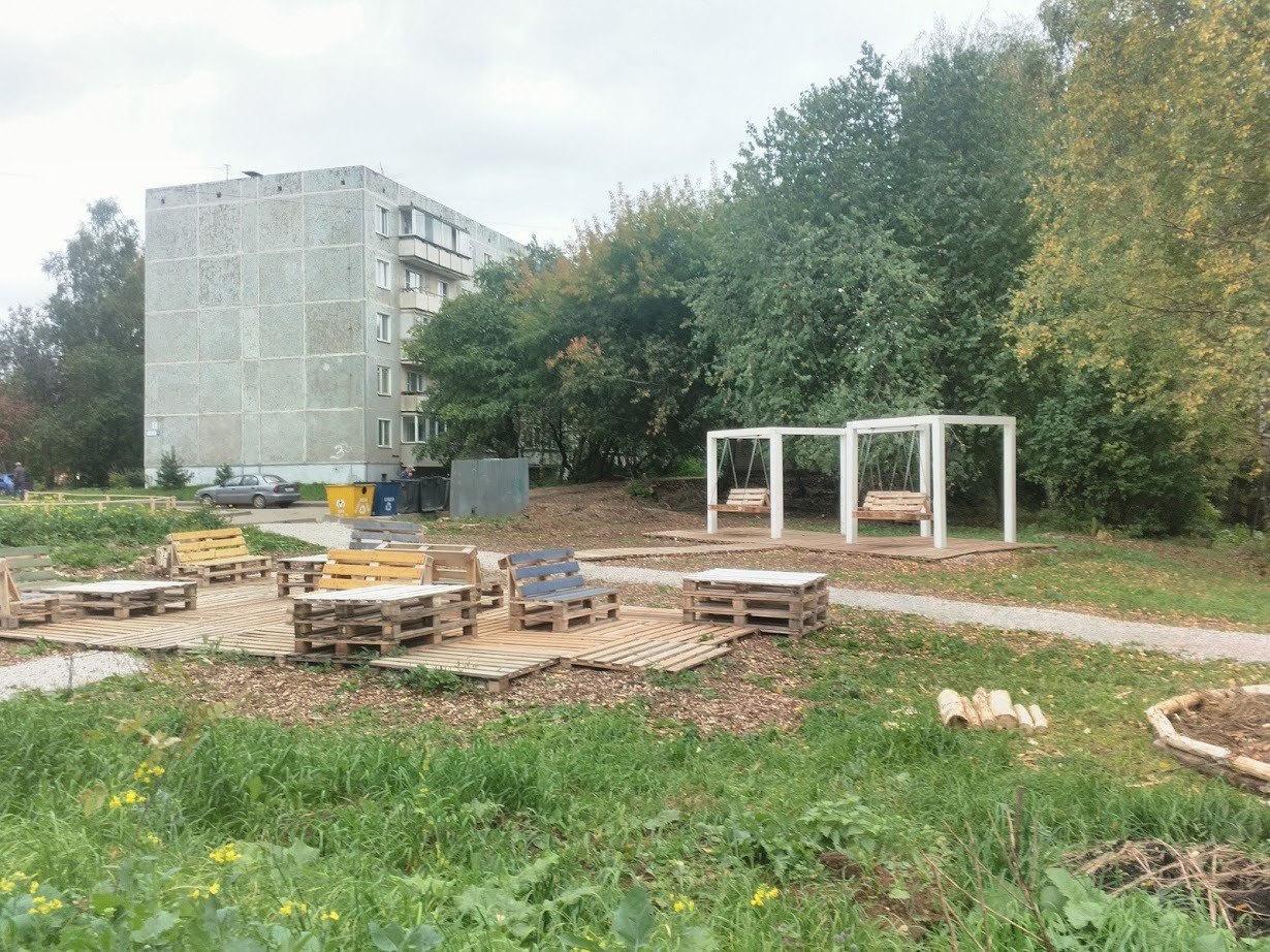 Пользователей насмешили качели из поддонов в новом сквере на Менделеева