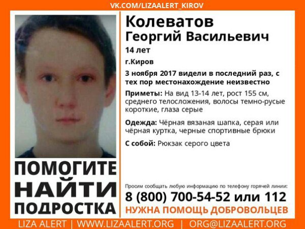 Информация об исчезновении 14-летнего Георгия Колеватова появилась у волонтеров поискового отряда «Лиза Алерт» 6 ноября.