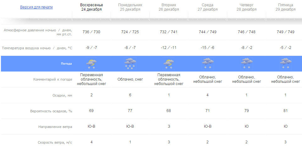 - в пятницу, 29 декабря, облачно, небольшой снег. Температура воздуха днем -2°C, а ночью -5°C.