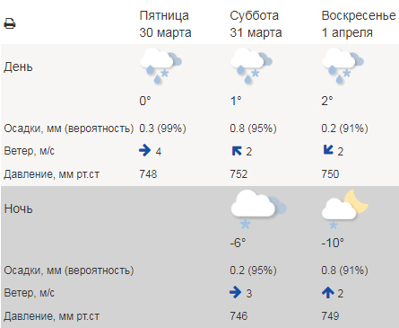 - в субботу, 31 марта, облачно, небольшие осадки в виде дождя и мокрого снега. Температура воздуха днем +1°C, а ночью -6°C. Ветер юго-восточный, западный 2-3 метра в секунду;