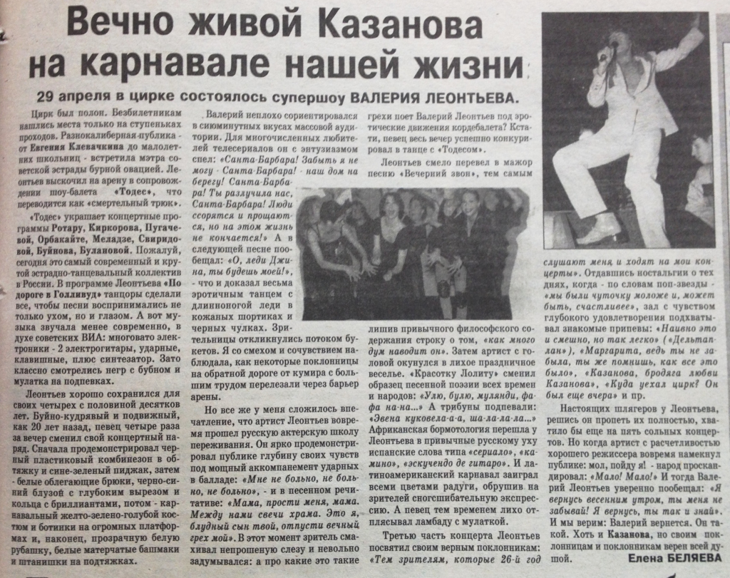 29 апреля в Кирове дал свой концерт не теряющий популярности Валерий Леонтьев. Цирк был полон, на Леонтьева пришли все: от школьниц и студенток до солидных бизнесменов, замечен даже был бывший мэр Евгений Клевачкин. Двухчасовое выступление артиста можно было разделить на три части: нераскрученные песни из новых альбомов, свежие хиты и попурри из старых добрых песен 70-80-х годов прошлого века. Особый интерес у публики вызвала «Хафана», которую Валерий пел в новогоднем мюзикле «Старые песни о главном - 3». В отчете о концерте журналистка «Наблюдателя» Елена Беляева так характеризовала Леонтьева: «Он хорошо сохранился для своих четырех с половиной десятков лет. Буйно-кудрявый и подвижный как 20 лет назад, певец четыре раза за вечер сменил свой концертный наряд...» Журналист «Вятского края» в свою очередь отметила, что «Леонтьев выглядел свежо, на плече певца синела татуировка, а в ухе и пупе сверкали бриллианты». Самым неожиданным подарком, который Валерий получил от кировских фанатов, стала початая наполовину бутылка шампанского. Классик отечественной эстрады принял подарок, заявив: «Спасибо всем за цветы и за выпивку тоже!» К сожалению, давать автографы и интервью Леонтьев отказался, но обещал еще не раз вернуться в Киров.