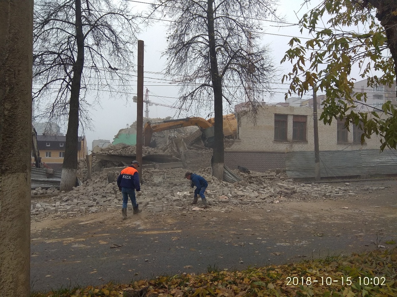 На снимках видно, что сотрудники подрядной организации, проводящей работы по сносу, одеты в спецовку компании Кировский ССК. Однако представитель застройщика сообщил, что компания Кировский ССК работы на этом участке не проводит: