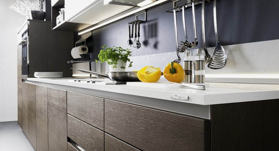 Чем меньше дробятся фасады гарнитура, тем гармоничнее и целостнее будет интерьер квартиры-студии. Сделайте два высоких выдвижных ящика вместо четырех стандартных. Закажите широкие кухонные модули вместо узких.