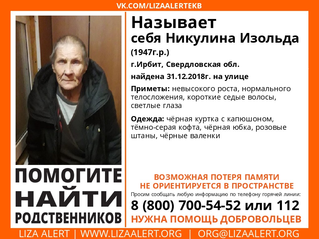 Пенсионерку 1947 года рождения нашли на улице 31 декабря 2018 года в Свердловской области. Об этом сообщили волонтеры поискового отряда «Лиза Алерт» из Екатеринбурга.
