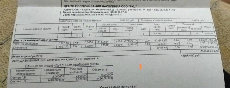 В Кирове мужчина получил счет за отопление, согласно которому он переплатил за отопление 169 тысяч рублей. Фото появилось в группе "Злой кировчанин".