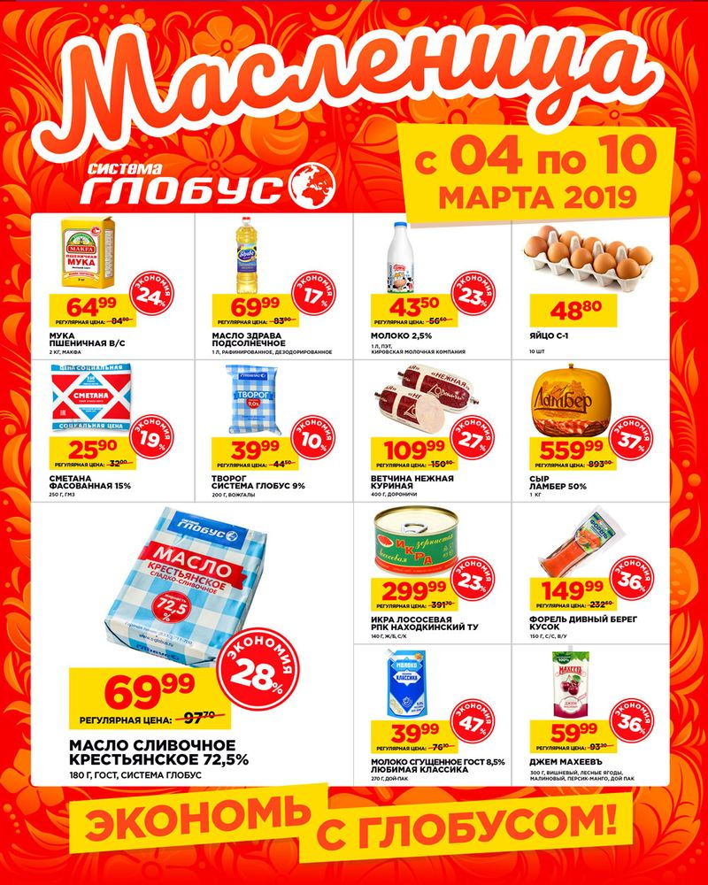 С 4 по 10 марта в супермаркетах сети «Система Глобус» началась масленичная неделя. В продаже здесь вы всегда можете приобрести аппетитные домашние блины – тонкие, румяные, ароматные.