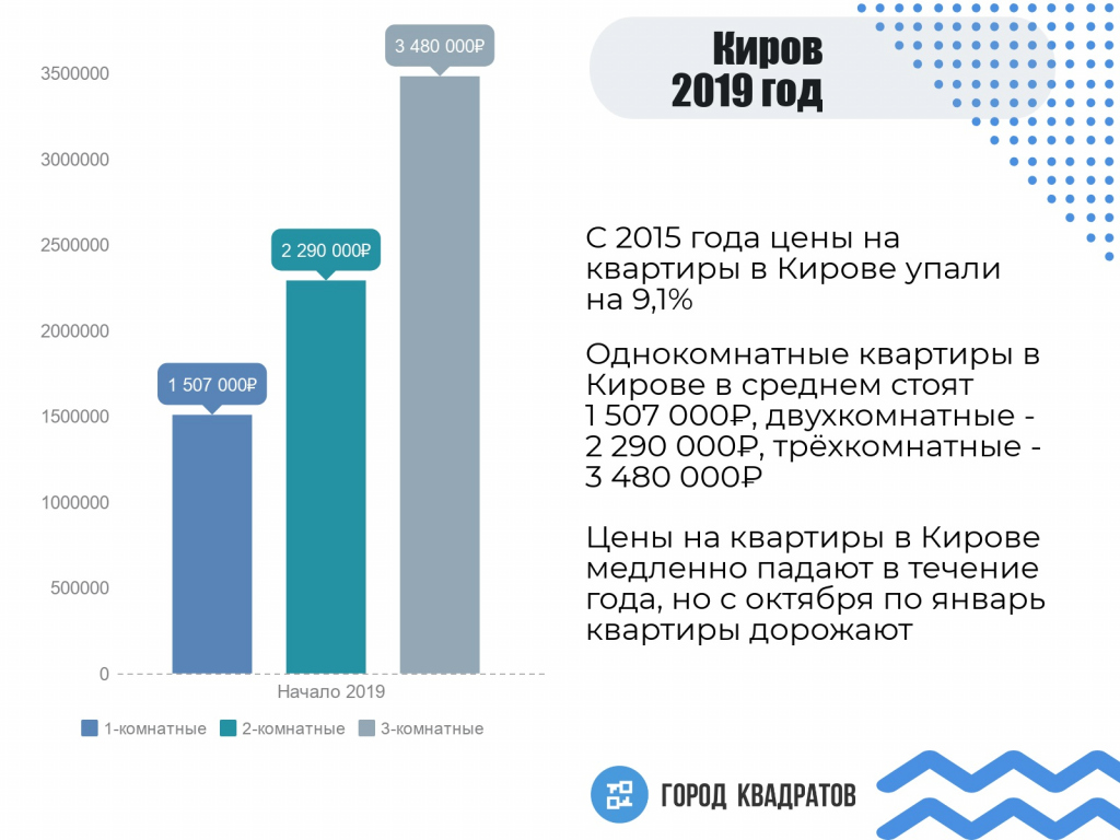 1. Средняя стоимость однокомнатной квартиры в Кирове на начало 2019 года составляет 1 507 000₽, двухкомнатной квартиры - 2 290 000₽, трёхкомнатной квартиры - 3 480 000₽. Средняя цена за квадратный метр - 46 059₽.