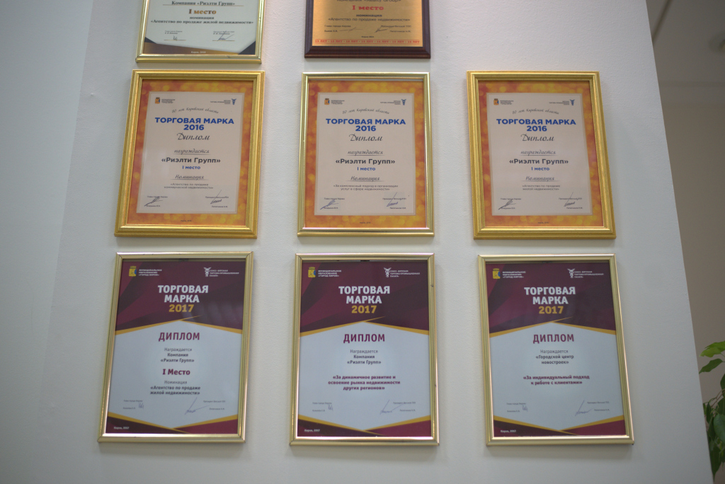 - полноправное членство в Российской Гильдии Риэлторов и первые места в региональном конкурсе «Торговая марка года» на протяжении 4 лет.