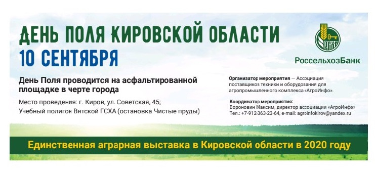 Главный праздник-ярмарка этого года — это место встречи руководителей и специалистов сельскохозяйственной отрасли региона. Мероприятие направлено на популяризацию новых агротехнологий и успешного опыта работы в сельскохозяйственном производстве, а также на стимулирование технического переоснащения сельхозпредприятий. Генеральным партнёром Дня Поля 2020 выступает Кировский филиала АО «Россельхозбанк».