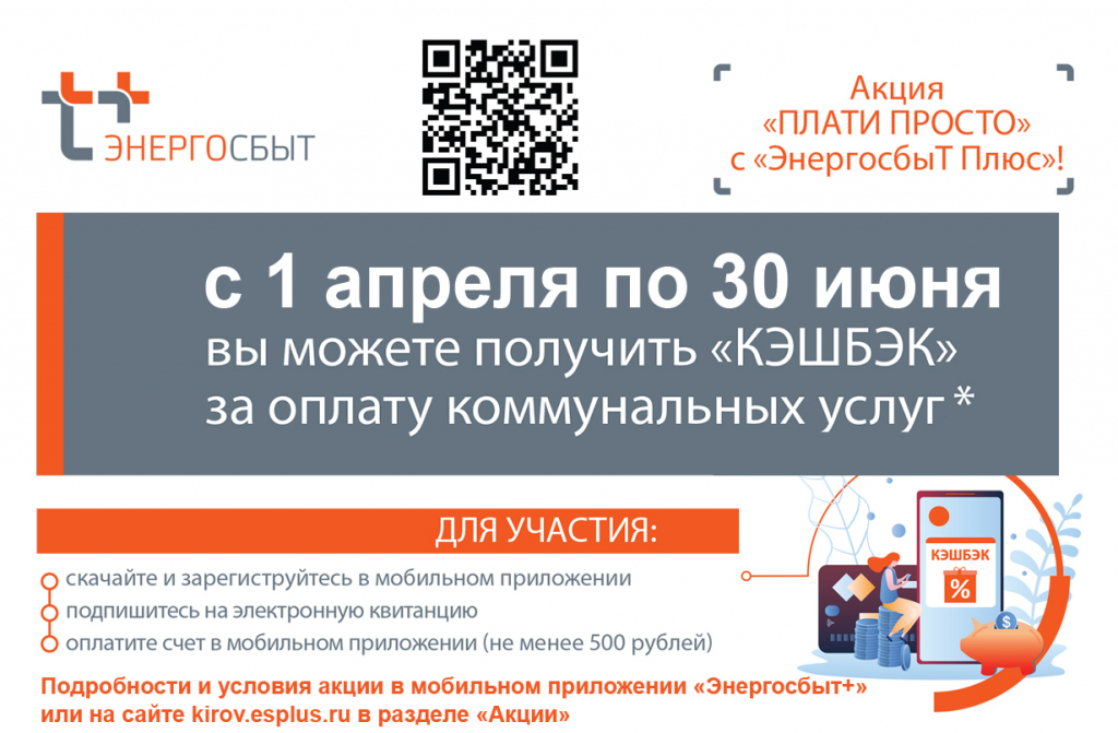 Кировский филиал «ЭнергосбыТ Плюс» продляет акцию «Плати просто» до 30 июня 2021 г. Акция проводится для клиентов Кировского филиала АО «ЭнергосбыТ Плюс» с апреля 2021 г.
