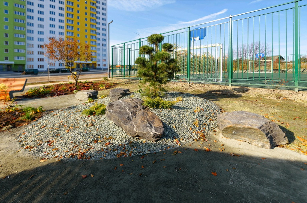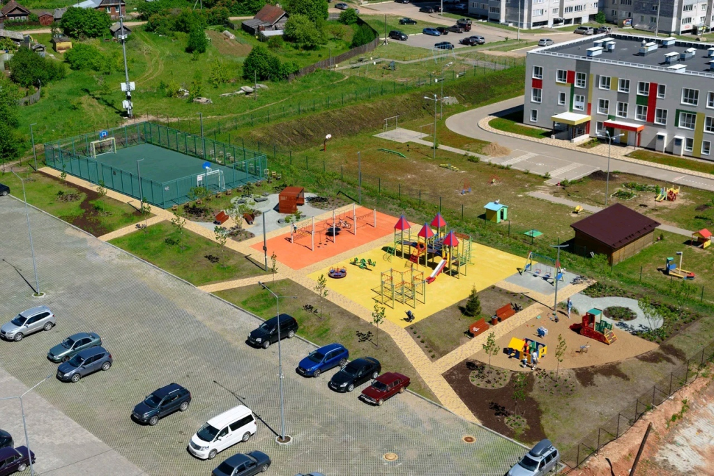 А для детей есть площадки с футбольными коробками, горками и качелями.
