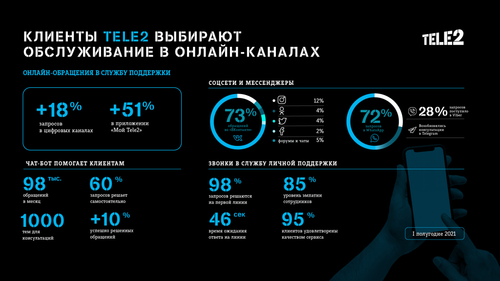 В Tele2 отмечают рост популярности цифровых каналов обслуживания. Клиенты все чаще получают консультации через онлайн-площадки: социальные сети, мессенджеры, мобильное приложение и сайт компании. В первом полугодии текущего года запросов в цифровых каналах стало на 18% больше, чем за аналогичный период прошлого года. Все больше людей для общения со службой поддержки компании используют приложение «Мой Tele2», где число обращений выросло на 58%.