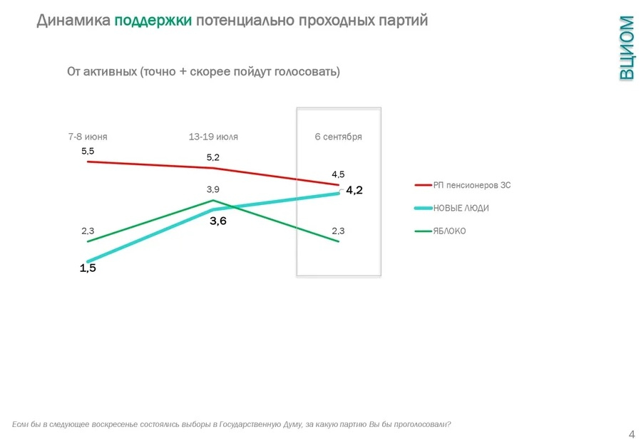 На первом месте, с точки зрения вероятности преодоления пятипроцентного барьера, — Новые люди. Чуть-чуть отстаёт «Партия пенсионеров», ― рассказал генеральный директор ВЦИОМ Валерий Федоров*. — «Яблоко» точно не проходит, но при этом получает госфинансирование, если прогноз сбудется.