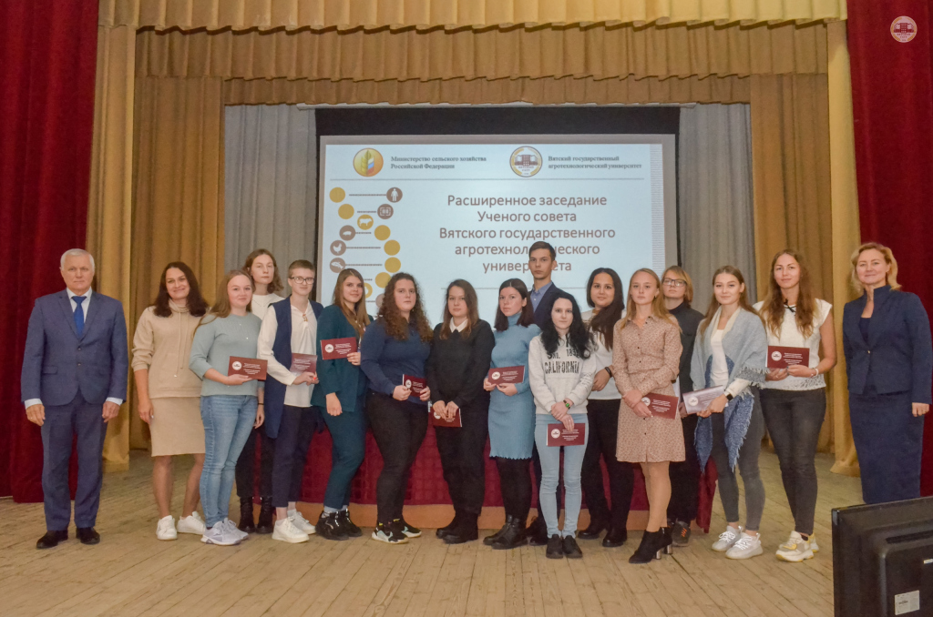 Учащихся поздравили на первом в этом учебном году ученом совете Вятского агротехнологического университета. Все стипендиаты обучаются направлениям: ветеринарная медицина, зоотехния, агрономия, технология производства и переработки сельскохозяйственной продукции.