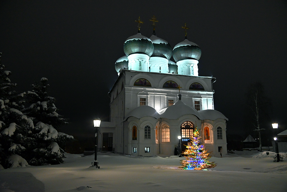 На торжественное богослужение собрался полный храм верующих. На территории Трифонова монастыря всех встречал вертеп.