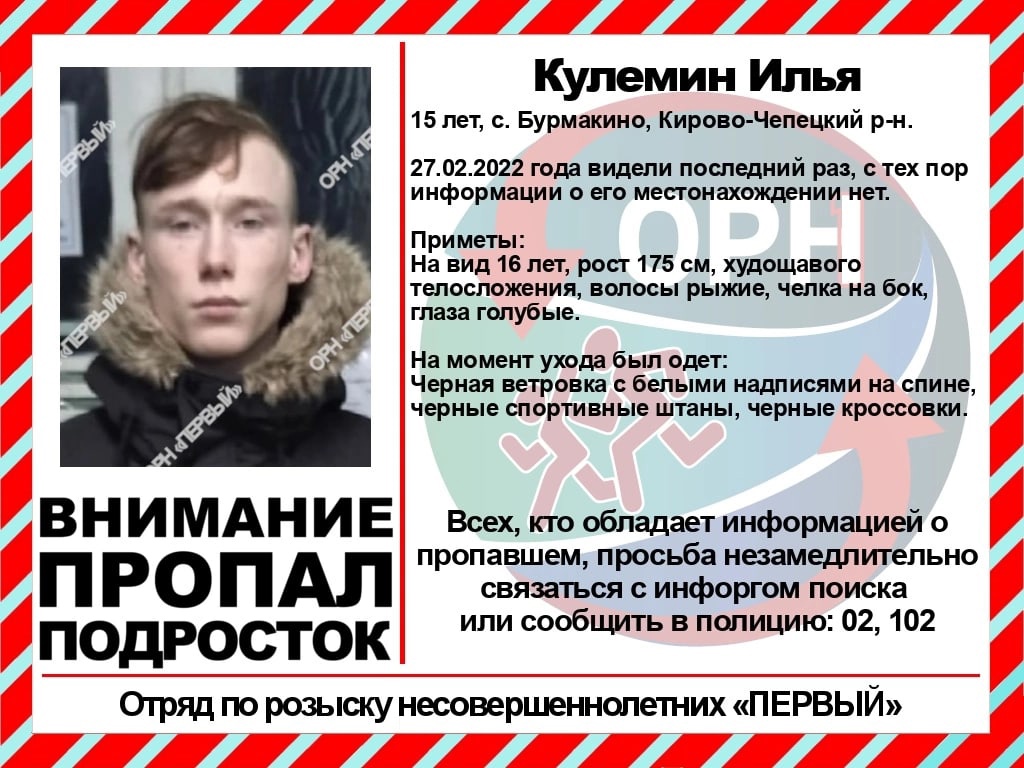 Отряд по розыску несовершеннолетних "Первый" сообщил о трех пропавших без вести подростках. 27 февраля 2022 года самовольно покинули школу-интернат в селе Бурмакино Кирово-Чепецкого района. С тех пор информации об их местонахождении нет. Могут находиться вместе в Кирове.
