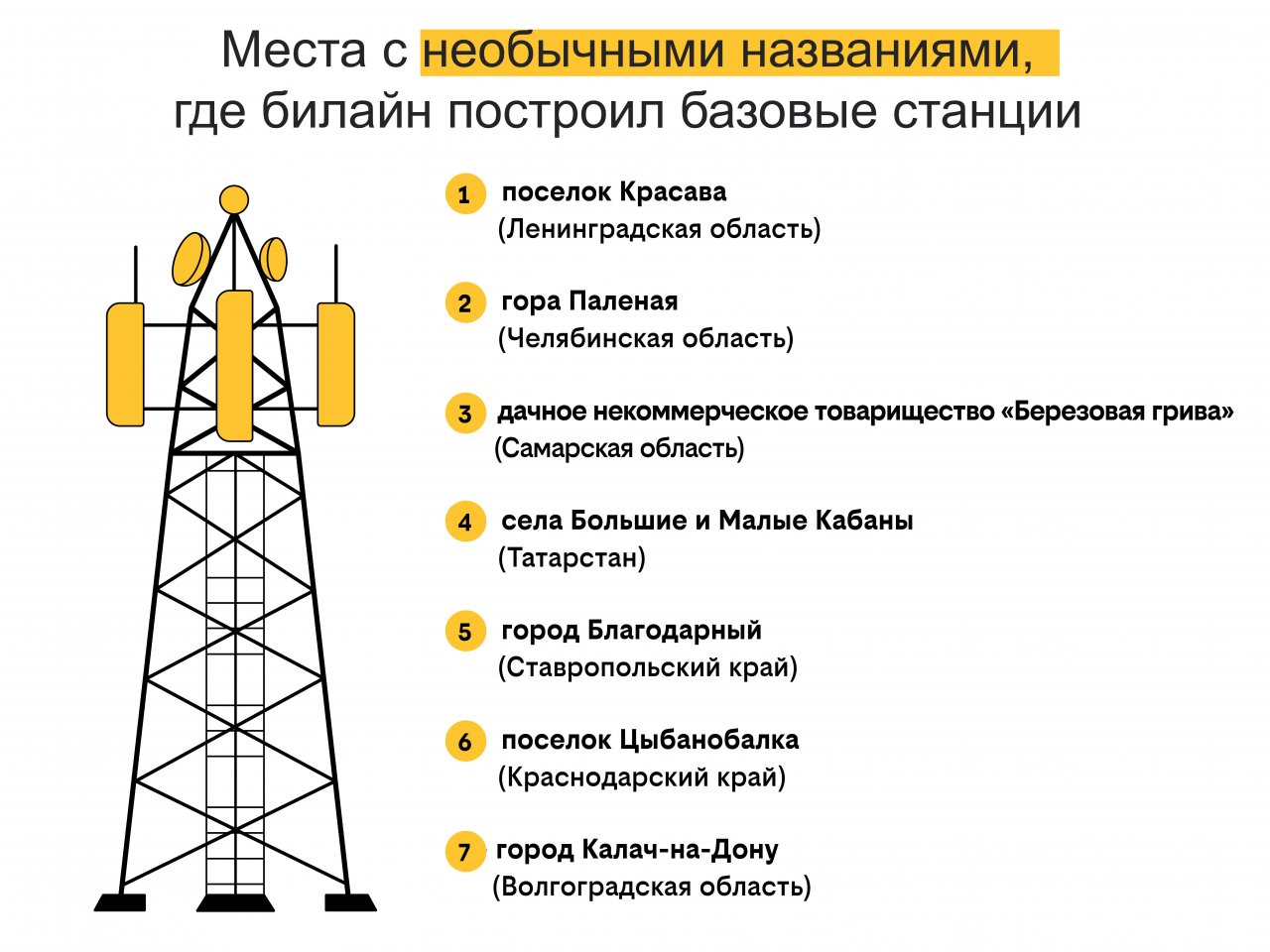 Любопытные факты из географии можно изучать по учебникам, а можно по итогам развития сети федерального оператора. В 2021 году технические специалисты билайн работали над ростом покрытия и емкостью сети в 2 700 населенных пунктах. Стройка проходила в 11 часовых поясах – на территории, равной по протяженности четверти экватора. Представители оператора поделились аналитикой, отражающей уникальность, разнообразие и при этом схожесть географических названий страны.