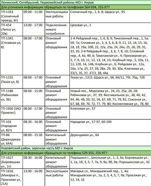 Электроэнергии не будет по следующим адресам: