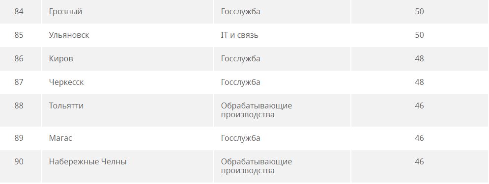 Ту же сумму получают работники государственных служб в Черкесске. В самом конце рейтинга работники аналогичной профессии из Саранска, Нижнего Тагила и Элисты. Там госслужащие имеют ежемесячно в среднем 41-42 тысячу рублей.