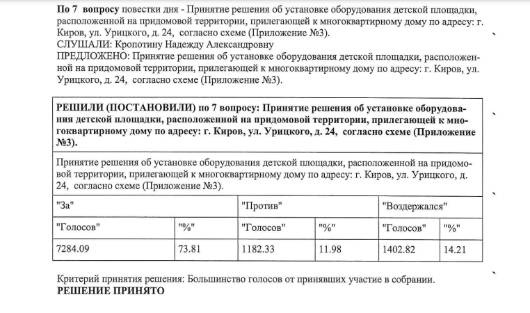 На собрании было принято решение об ограждении детской игровой площадки. За это решение проголосовали 76 процентов жильцов. Работы по установке ограждения проведены за счет собственников квартир дома. Их стоимость вместе с установкой шлагбаума у дома составила чуть более 300 тысяч рублей.