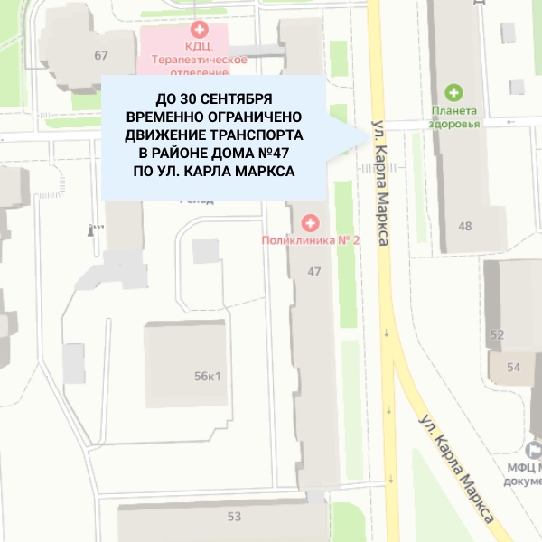 В администрации города Кирова рассказали, что временно перекроют участок улицы Карла Маркса. Речь идет об отрезке в районе дома №47. Временное ограничение движения для транспортных средств продлится до 30 сентября.