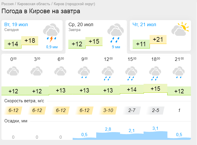 Дождливая погода в Кирове задержится еще на один день. Согласно прогнозу погоды, опубликованному на сайте "Гисметео", в среду, 20 июля, в городе весь день будет идти дождь.
