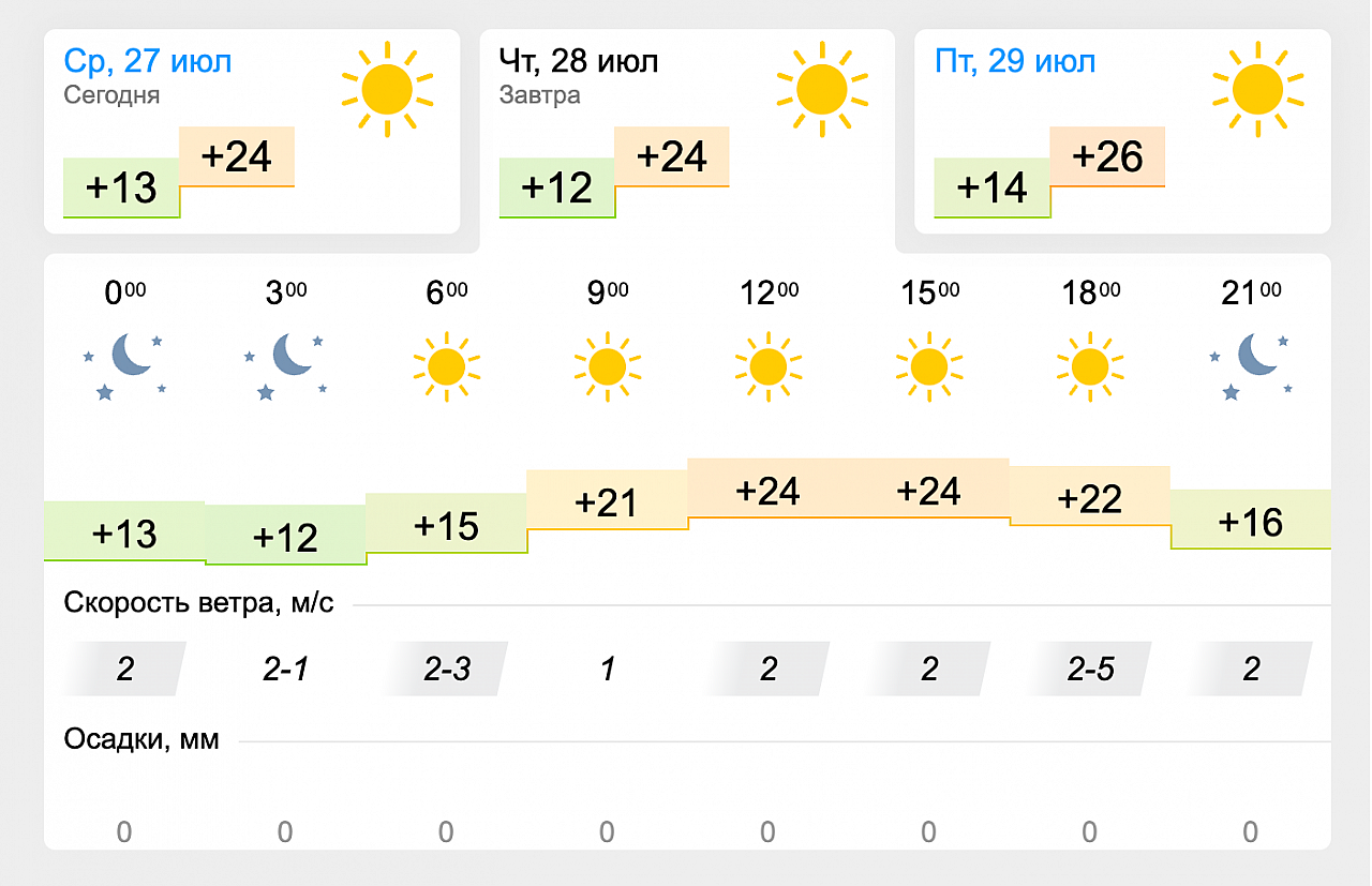 В четверг, 28 июля, столбик термометра днем поднимется до 24 градусов Цельсия. Осадков не предвидится. Будет дуть восточный и юго-восточный ветер со скоростью 1-2 метра в секунду.